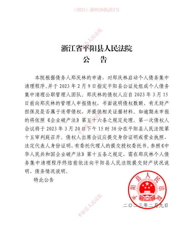 鄭慶林個人債務集中清理公告