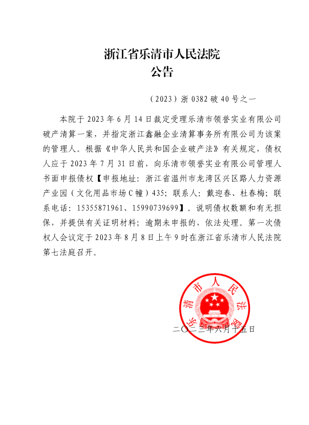 樂清市領譽實業有限公司破產清算案公告