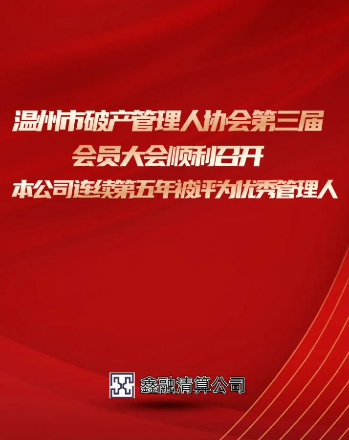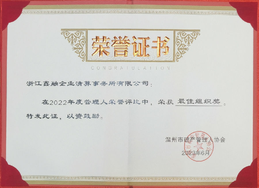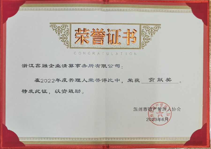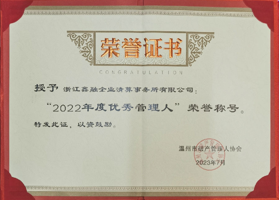 本公司王浩宇總經(jīng)理在大會(huì)中當(dāng)選溫州市破產(chǎn)管理人協(xié)會(huì)副會(huì)長(zhǎng),同時(shí)本公司在2022年度中榮獲年度貢獻(xiàn)獎(jiǎng)、最佳組織獎(jiǎng)、總經(jīng)理王浩宇榮獲業(yè)務(wù)開拓獎(jiǎng)。本公司連續(xù)五年在溫州市中級(jí)人民法院組織的管理人履職評(píng)價(jià)中被評(píng)為“年度優(yōu)秀管理人”。鑫融全公司將珍惜榮譽(yù),永葆初心,繼續(xù)砥礪前進(jìn)!