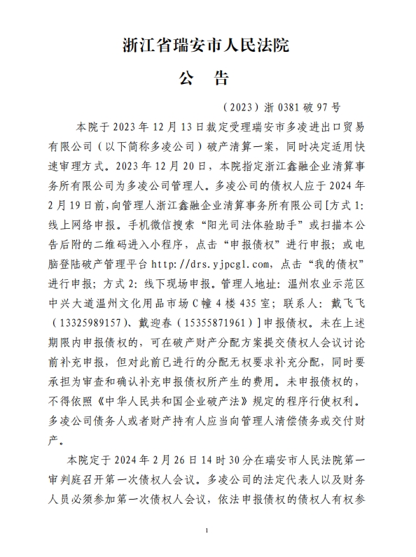 瑞安市多凌進(jìn)出口貿(mào)易 有限公司破產(chǎn)清算公告