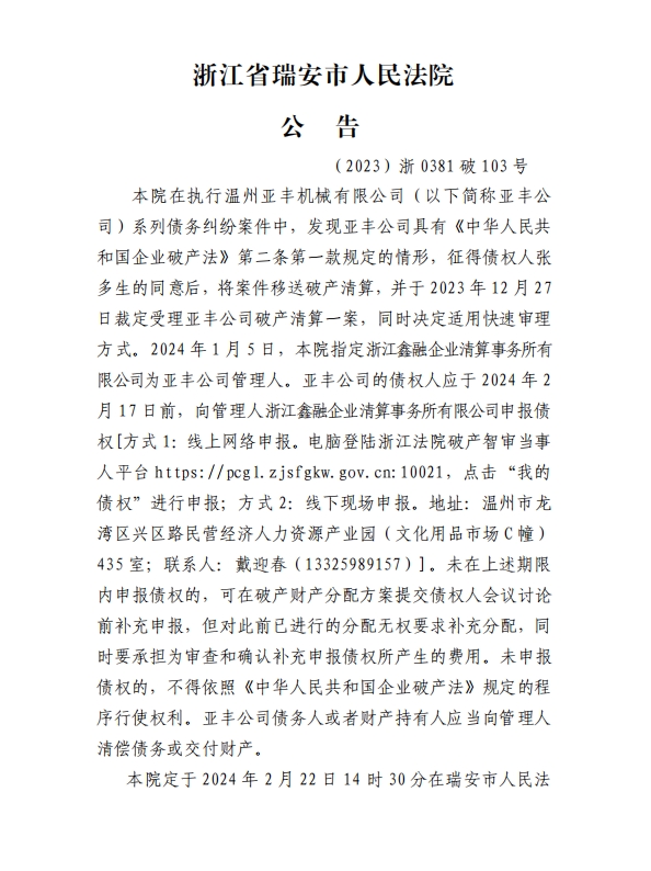 行溫州亞豐機(jī)械有限公司破產(chǎn)清算公告