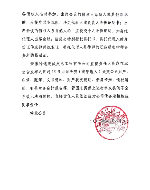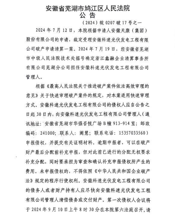蕪湖科速光伏發電工程有限公司破產清算案公告