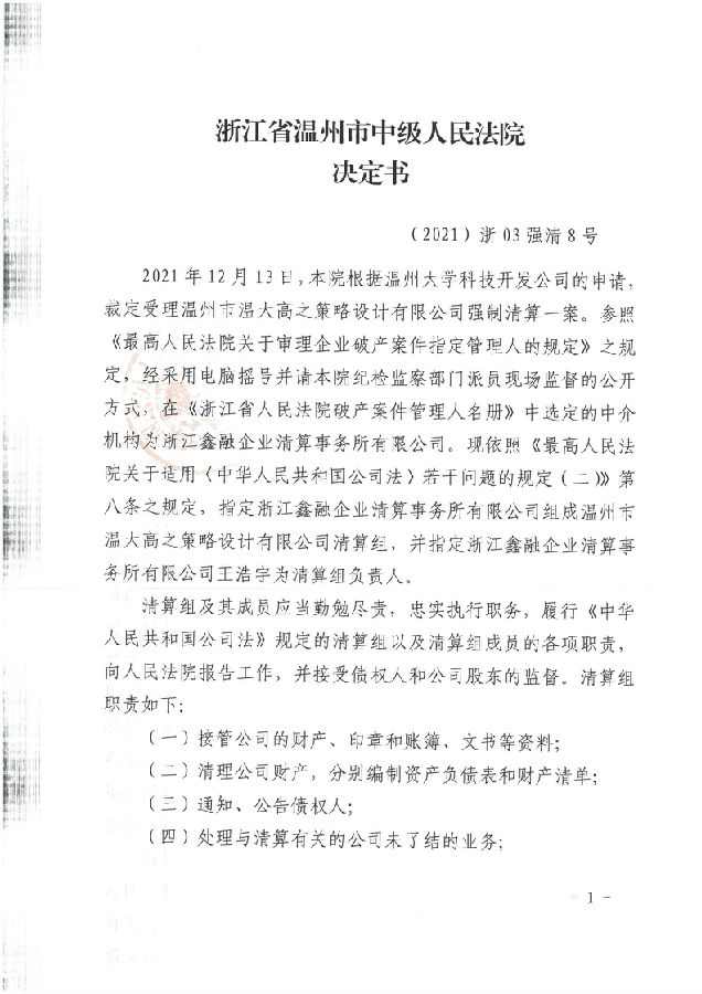 溫州溫大高之策略設計有限公司強制清算案決定書